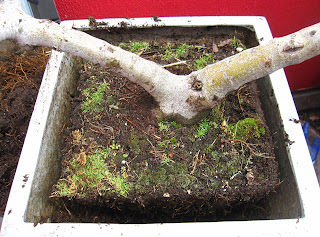 How did I know I should prune the roots? First, a very, very compact feel to the soil in the pot. No loose soil. Second, when it is watered the water runs straight through, like a sieve. This necessitates multiple waterings to make sure the roots have time to absorb anything. Not a problem now, but it will be in summer. Third, moss. My pots always pack on the moss when the roots are compacted. I think it likes the firm structure and rapidly draining, frequent watering. Another obvious clue, and I was unable to see this before I pruned, if you can pull the plant from the pot and see its roots visibly wrapping round and round, it needs pruning.
