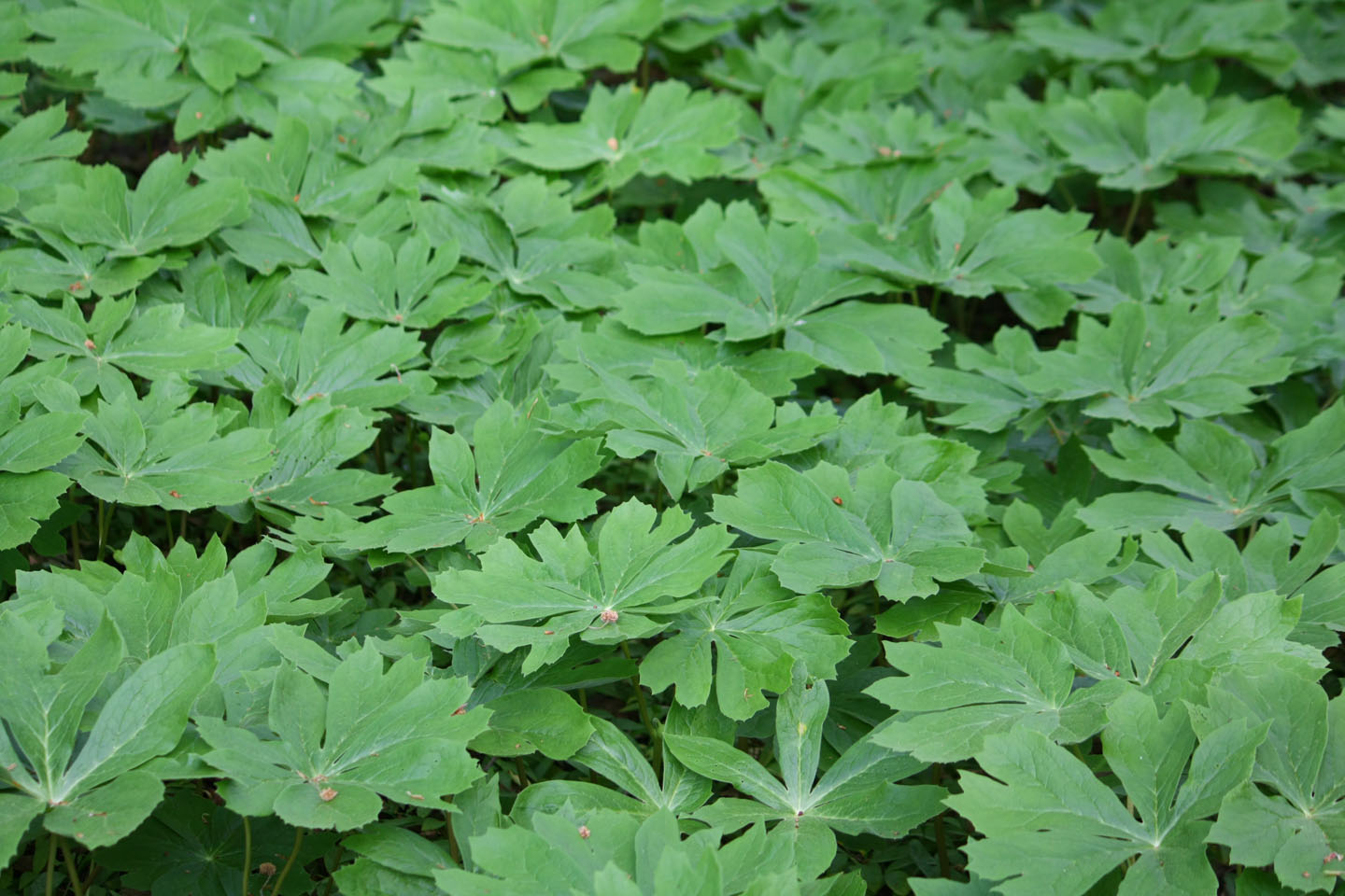 I had not realized that they are planted as companions to the Erythornium americanum - the trout lilies that I love. It makes perfect sense as the trout lilies are dormant after spring and disappear. The May apples, later to emerge, cover the small plants' disappearance in green umbrellas (below). What is interesting is how complete the cover of each is. The trout lilies are packed together and you'd think there would be no space for anything else. Shallow corms, deep rhizomes.
