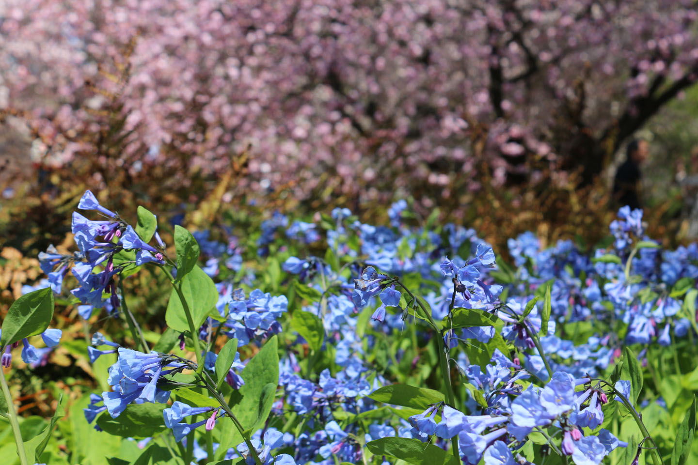 Here, native Mertensia virginica - Virginia bluebells - hold their own in the company of the imported, media-friendly crowd of cherries.