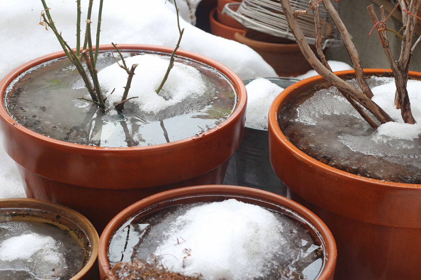 The good thing, perhaps, is that this water is not draining because the rest of pot is still frozen solid. So the plants' roots are not yet suffocating. They're frozen. Still, I stand the pots on their sides and tip the water out.
